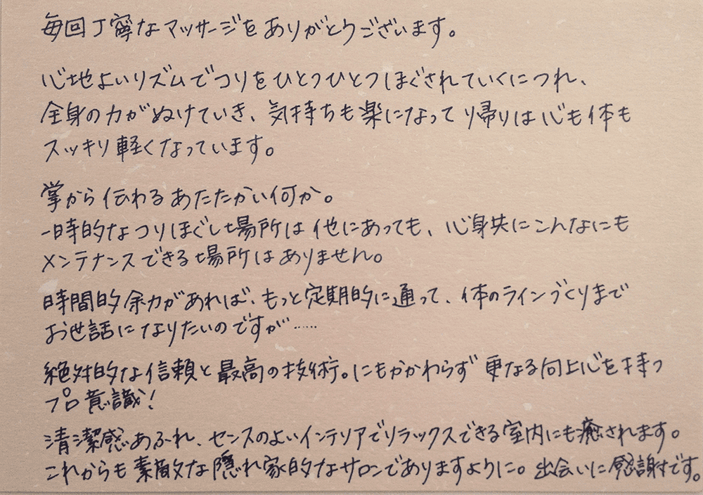 リピーター様専用、隠れ家サロンになります。ご希望の方にご案内させていただきます。